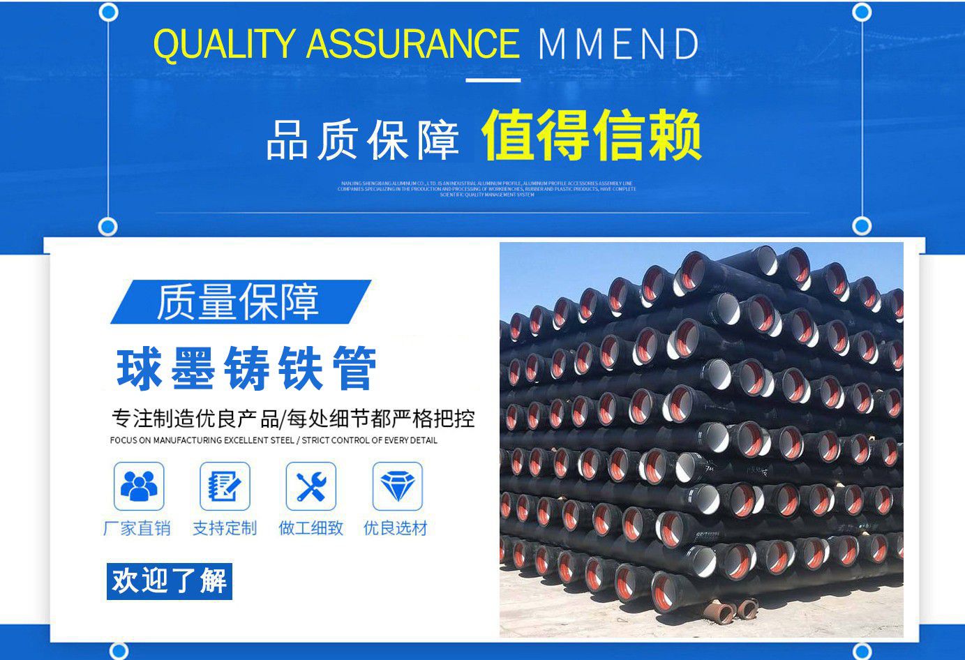 山西飛翔鑄業(yè)有限公司是一家以新興技術致力于研制開發(fā)、生產(chǎn)、銷售、施工安裝各種球墨管廠家,球墨鑄鐵管價格,國標球墨管,k9球墨鑄鐵管,國標球墨鑄鐵管,離心球墨鑄鐵管等系列鑄鐵產(chǎn)品。公司擁有完善的銷售、售后服務體系及一支由鑄造專家、工程師組成的精通產(chǎn)品設備和生產(chǎn)鑄造的技術力量隊伍。隨著企業(yè)的發(fā)展,我們積累了豐富的鑄造經(jīng)驗與科技水平。使得產(chǎn)品具有高強度、高韌性、耐腐蝕性強等性能。同時,我們獲得質量管理體系認證、產(chǎn)品質量認證、職業(yè)健康體系認證、環(huán)境管理體系認證。產(chǎn)品暢銷各地并打入韓國、新加坡等東南亞市場。 在未來的發(fā)展中,公司奉行誠信共雙贏,合作創(chuàng)盛世的企業(yè)理念。讓我們一起共創(chuàng)美好未來!  公司產(chǎn)品采用良好的工藝流程,以確保產(chǎn)品質量的穩(wěn)定性:以良好的設備,確保質量的可靠性。廣泛應用于國內外城市的市政建設,通信,自來水,消防,園林,環(huán)保等行業(yè),產(chǎn)品大獲贊譽!  我們有多年的井蓋生產(chǎn)經(jīng)驗,多名老技術工人有將近二十年的生產(chǎn)經(jīng)驗,還聘請多名新技術研發(fā)人員,因為我們始終堅信質量才是未來生存的根本,只有把質量保證了,企業(yè)才會有更加美好的未來。公司堅持用心服務,誠信為本,與時俱進,科技為先的企業(yè)理念,堅持科技先導、竭誠為廣大用戶服務。歡迎各界朋友蒞臨我公司參觀,指導洽談業(yè)務,相信選擇我們就是選擇我們共贏的明天...